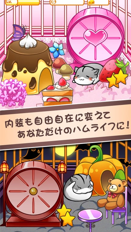 ハムスターライフは、可愛いハムスターがいっぱいの“究極の癒し系”無料育成ゲームです。ご飯をあげたり、撫でたり、お腹いっぱいになるとハウスへご飯を持ち帰ったり、ハムちゃんの可愛い仕草がいっぱい。パズルゲームで集めた星を、コイン、チーズ、ハムスターなど様々な商品に交換することができます。集めたコインで家具を買って模様替えしたり、ガチャを回してハムちゃんのかわいいコスチュームをコレクションすることも可能!撫でるもよし、エサをあげるもよし、回し車に乗せるもよし、ただ眺めてるもよし。育成方法は様々です。毎日育成してハムちゃんの色んな表情を探しましょう。